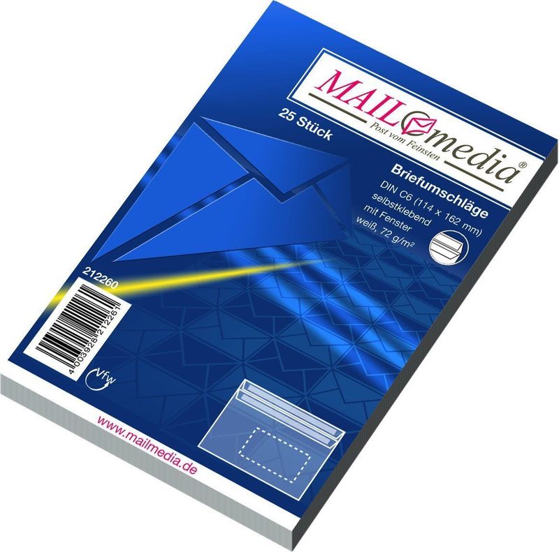 Briefumschlag, Klebeart selbstklebend, Papier 72 g/qm, KA/PG mit 25 Stück, Hersteller: Elepa Rössler: Herstellernummer: 212260, EAN: 4003928212261, Farbe: weiß, holzfrei., Preis je Packung