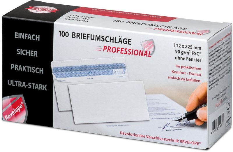 Das umweltfreundliche Haftklebewunder ohne Abziehstreifen mit patentierter Revelope-Klebung. Ein Sicherheits-Innendruck garantiert einen perfekten Blickschutz beim Versand, die Sicherheitsschlitze machen Manipulationen an der Verschlussklappe sichtbar. Briefumschlag ohne Fenster. Format: 112x225mm. Offset-Papier: weiß, 90 g/qm. Revelope-Klebung, Verpackung á 100 Stück.