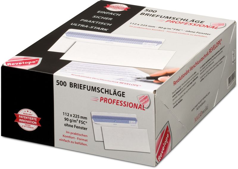 Das umweltfreundliche Haftklebewunder ohne Abziehstreifen mit patentierter Revelope-Klebung. Ein Sicherheits-Innendruck garantiert einen perfekten Blickschutz beim Versand, die Sicherheitsschlitze machen Manipulationen an der Verschlussklappe sichtbar. Briefumschlag ohne Fenster. Format: 112x225mm. Offset-Papier: weiß, 90 g/qm. Revelope-Klebung, Verpackung á 500 Stück.