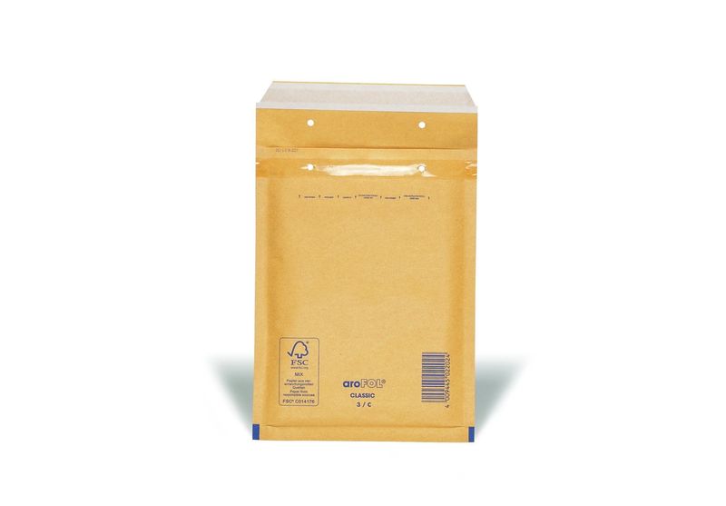 Versandtasche (Luftpolster), Typ Nr. 3, Innengröße (B x H) 150x215 mm, Gewicht 12 g, Karton mit 100 Stück, Hersteller: Arofol ®: Herstellernummer: 2FVAF000003, EAN: 4009445010236, Leichte Luftpolster-Versandtasche aus unbeschichtetem --Papier mit Polsterung aus Polyethylen (PE). Mit Trifix-Verschluss. Nr. 8 - 10 nur als Postpaket verwendbar. Größe 1+2 mit einem Loch, ab Größe 3 und CD mit 2 Löchern, für Disketten ohne Löcher., Preis je Packung