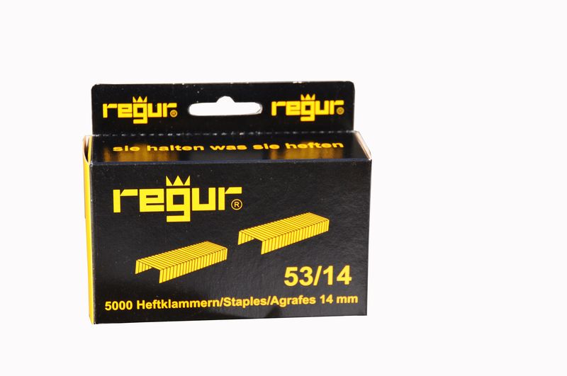 Heftklammer für Büroheftgerät, Ausführung 5000 Heftklammern 53/14, Hersteller: Regur®: Herstellernummer: Regur 53/14, EAN: 4001973553148, Bespannen, Isolieren, Dekorieren, Kabelbefestigung, Zier- und Glasleistenbefestigung mit einem Gerät. Metall/Kunststoffgehäuse. Klammermagazin leicht zugänglich, mit hoher Kapazität. Transportsicherung ohne Leerschuss möglich. Für normale Heftklammern (Regur® 53 und 37), Kabelklammern (Regur® 28) und Brads (Regur® 12). Farbe: blau-gelb., Preis je Packung