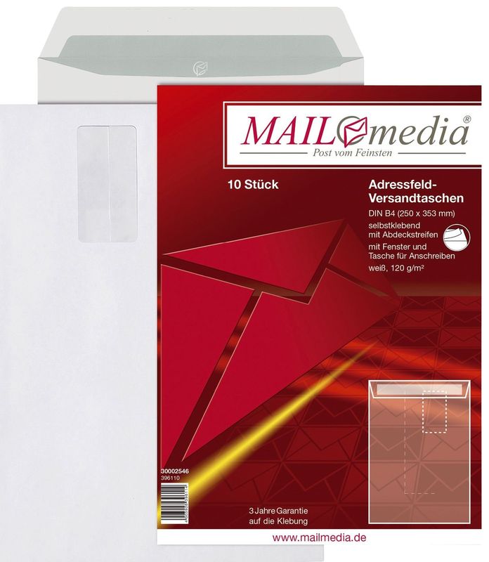 Versandtasche B4 mit Lasche auf der kurzen Seite und Normfenster (45 x 90 mm) links. Qualität holzfrei weiß, grauer Innendruck, selbstklebend mit Abziehstreifen. Innen mit Einschublasche in der ein auf A5 gefalteter A4 Brief eingelegt werden kann. Durch das richtige Einschieben in die Lasche bleibt das Adressfeld des Briefes im Fenster sichtbar. Eignen sich optimal für Bewerbungsunterlagen / Bewerbungsmappen, für Katalog und Prospektversand.Fenster 45 x 90 mm horizontal. Kleinpack á 10 Stück.