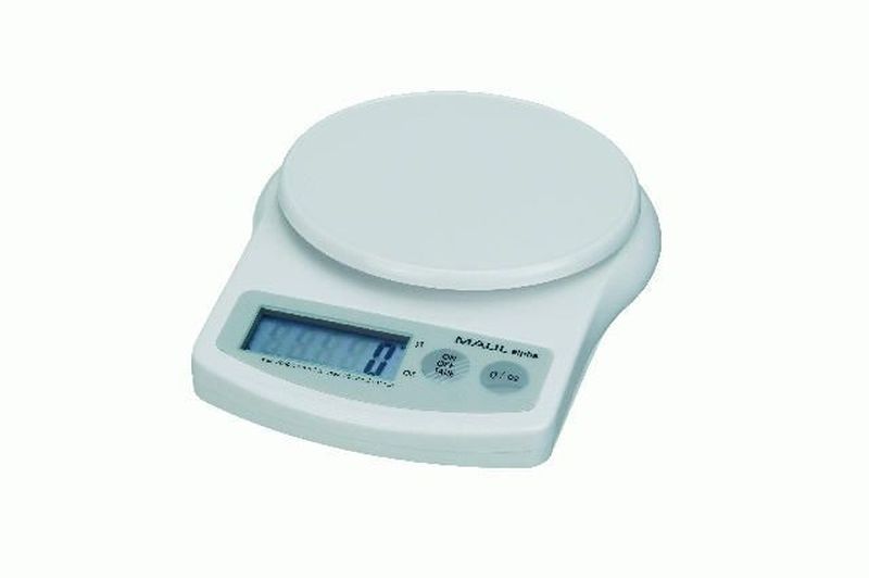 Elektronische Briefwaage (Büro), Farbe weiß, Hersteller: Maul: Herstellernummer: 164 2002, EAN: 4002390040952, Briefwaage mit Batteriebetrieb, inklusive zwei 1,5 V Micro-Batterien (AAA). Gehäuse aus bruchsicherem Kunststoff. Ein-Tasten-Bedienung: On-Off-Tare. Umschaltbar g/oz. Benutzerkalibrierung möglich. Abschaltautomatik, automatische Nullstellung. Größe 18,8 x 13,7 x 3,6 cm. Wiegeteller Ø 12 cm. Mindestlast 2 g. CE-Zeichen. Tragkraft: 2000 g. Teilung: 1 g. Garantie: 2 Jahre., Preis je Stück
