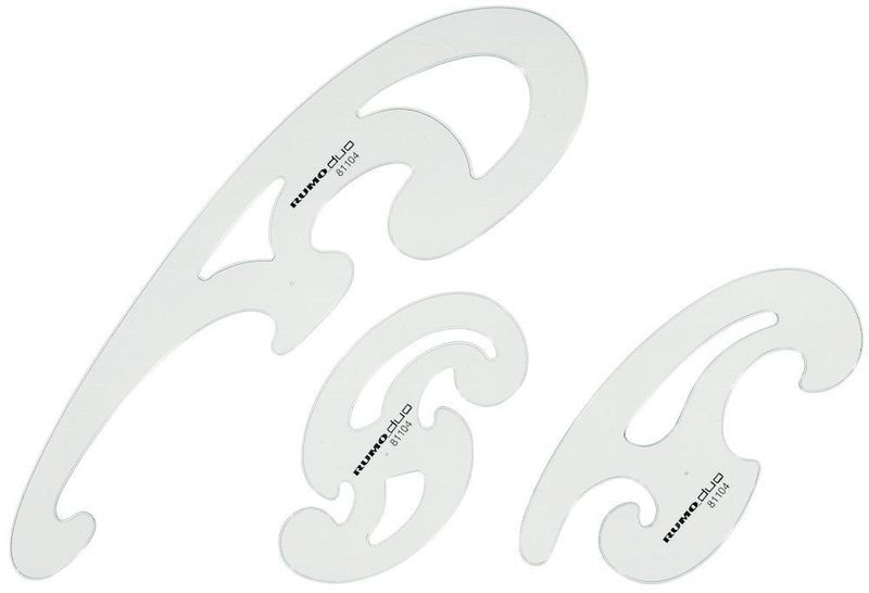 Burmesterkurven-Satz, Hersteller: Rumold, Herstellernummer: 81104, EAN: 4012108066600, Kurvenlineale aus hochwertigem Kunststoff, mit doppelter Facette für Tuschearbeiten. Dreiteiliger Set in umweltfreundlicher PP-Tasche. Farbe: rauchgrau getönt., Preis je Stück