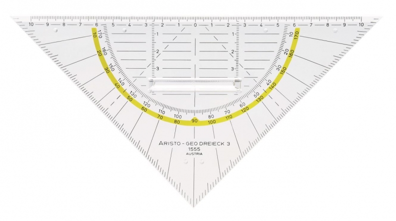 GEO-Dreiecke, Hypotenuse 225 mm, Hersteller: Aristo, Herstellernummer: AR1555/2, EAN: 9003182155521, Maßstab, Winkelmesser, Symmetrie-Maßstab und Parallel-Lineal in einem Gerät. Aus glasklarem Plexiglas. Winkelbezifferung gelb hinterlegt. Mit Facette und Tuschenoppen., Preis je Stück