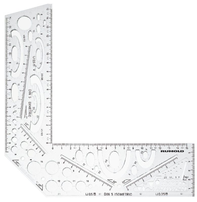 Perspektiv Eck Techno, Hersteller: Rumold, Herstellernummer: 354110, EAN: 4012108135900, Schablone für das perspektivische Zeichnen im Ausbildungsbereich. Für die isometrische Projektion mit Ellipsen und die Kavaliersperspektive. Oberflächenzeichnen und Hilfslinien für Normschrift ISO/DIN 2,5;3,5;5 und 7mm. Mit umlaufender Tuschekante und Tuschenoppen., Preis je Stück