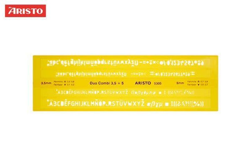 Schriftschablone Duo-Kombi, Hersteller: Aristo, Herstellernummer: AR5305, EAN: 9003182053056, Kombi-Schriftschablone für Pigmentliner und Feinminenstifte in den Schriftgrößen 3,5 und 5 mm. Schrift gerade (Mittelschrift). Typ B. ISO 3098/1, DIN 6776. Aus gelb-transparentem Kunststoff. , Preis je Stück